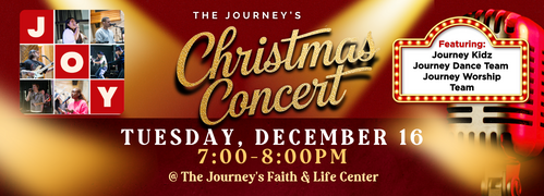Join others from the Journey as we come together to sing Christmas songs, worship together, and receive a wonderful Christmas devotion from Lead Pastor Kerrick Thomas. This will be a great night to fellowship and worship together as a church family.
